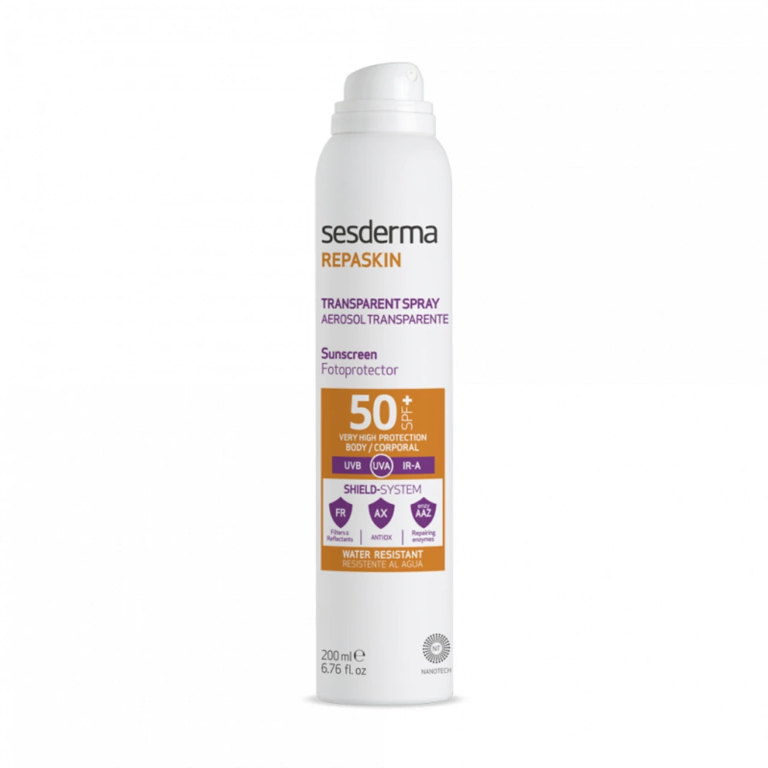 El nuevo Repaskin Aerosol Transparente es muy práctico y su aplicación es muy cómoda. Además, se seca rápidamente para lograr un acabado transparente en cualquier tipo de piel. Mantén tu cuerpo protegido todo el verano con Repaskin y disfruta de una exposición solar sana y responsable. Es ideal para aquellas personas que buscan la comodidad y practicidad y buscan la máxima protección frente al sol. El único solar con la exclusiva tecnología SHIELD SYSTEM que no solo protege, sino que también repara el fotodaño. Además, también ayuda a prevenir la aparición de manchas y arrugas prematuras.